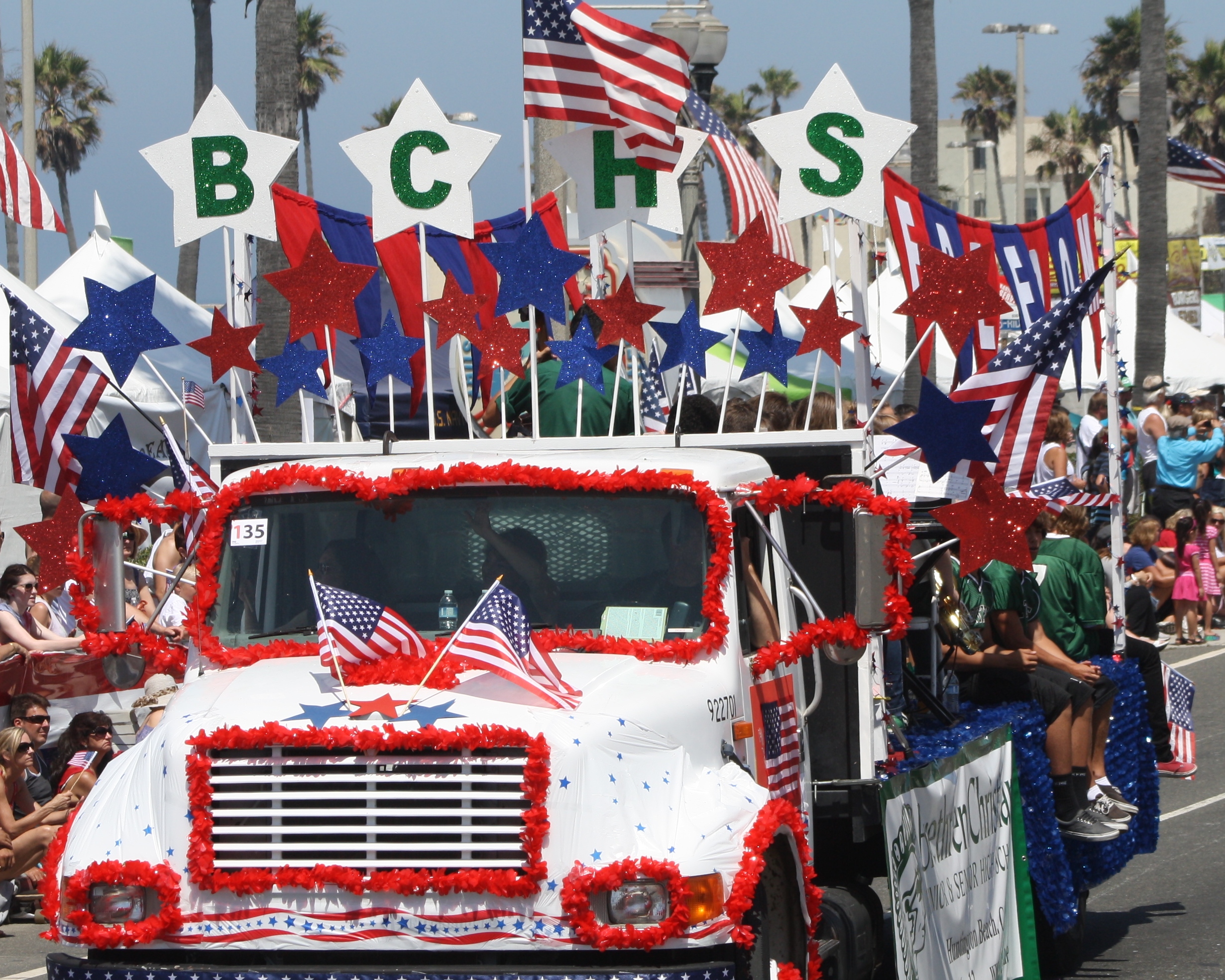Huntington Beach 4th من تموز / يوليه موكب, Huntington Beach, California. المشاركين من الإخوة المسيحيين المدرسة الثانوية في هنتنغتون بيتش العرض. تطفو من قبل الاخوة المسيحيين الثانوية فاز Huntington Beach Parade جون فيليب سوسا الجائزة. الصورة مجاملة من إدوارد Pinchiff.