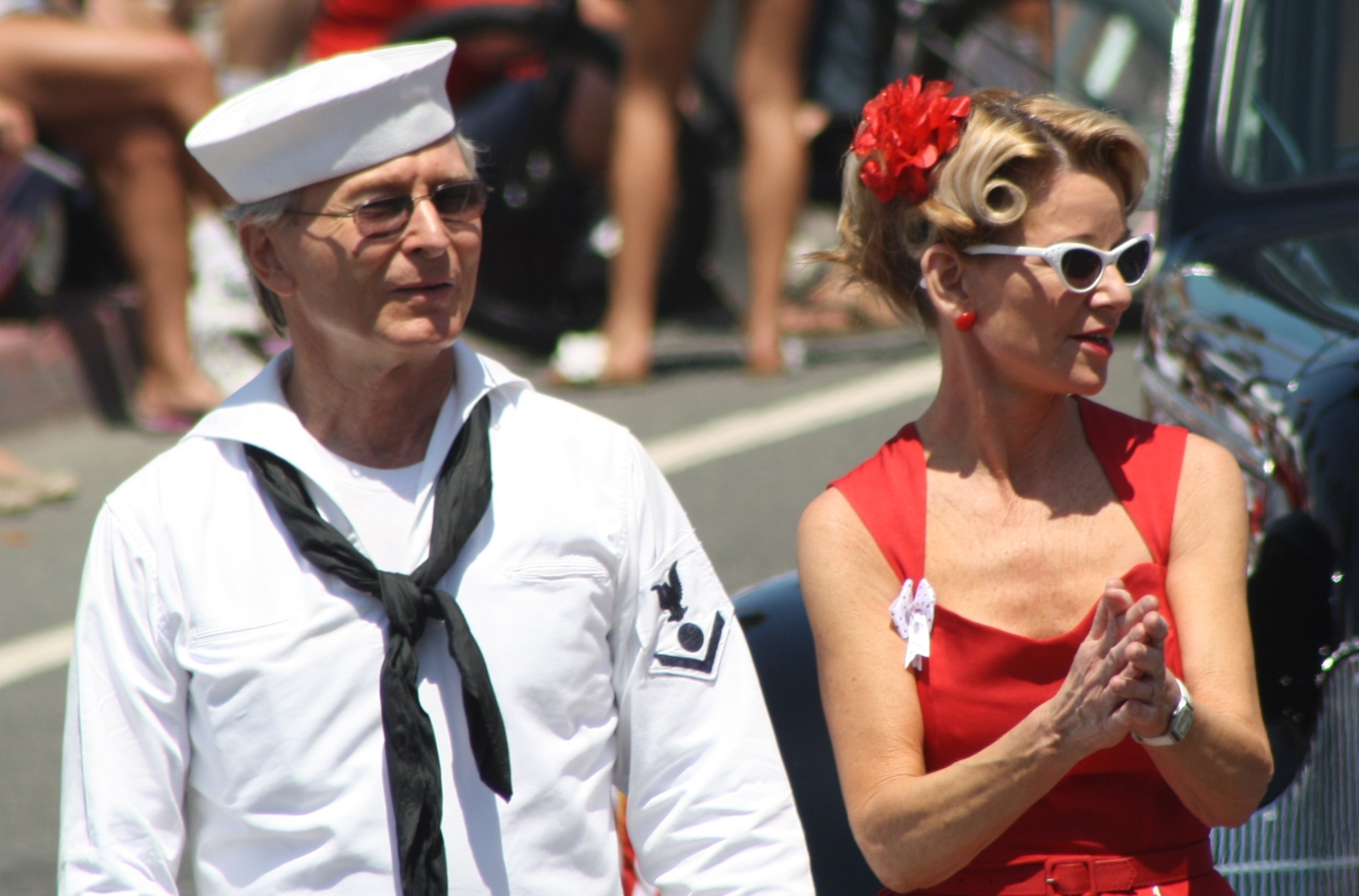 Huntington Beach 4th من تموز / يوليه موكب, Huntington Beach, California. القضية النبيلة مؤسسة المشاركين في خمر الحرب العالمية الثانية بحار الزي والملابس الرقص في هنتنغتون بيتش العرض.