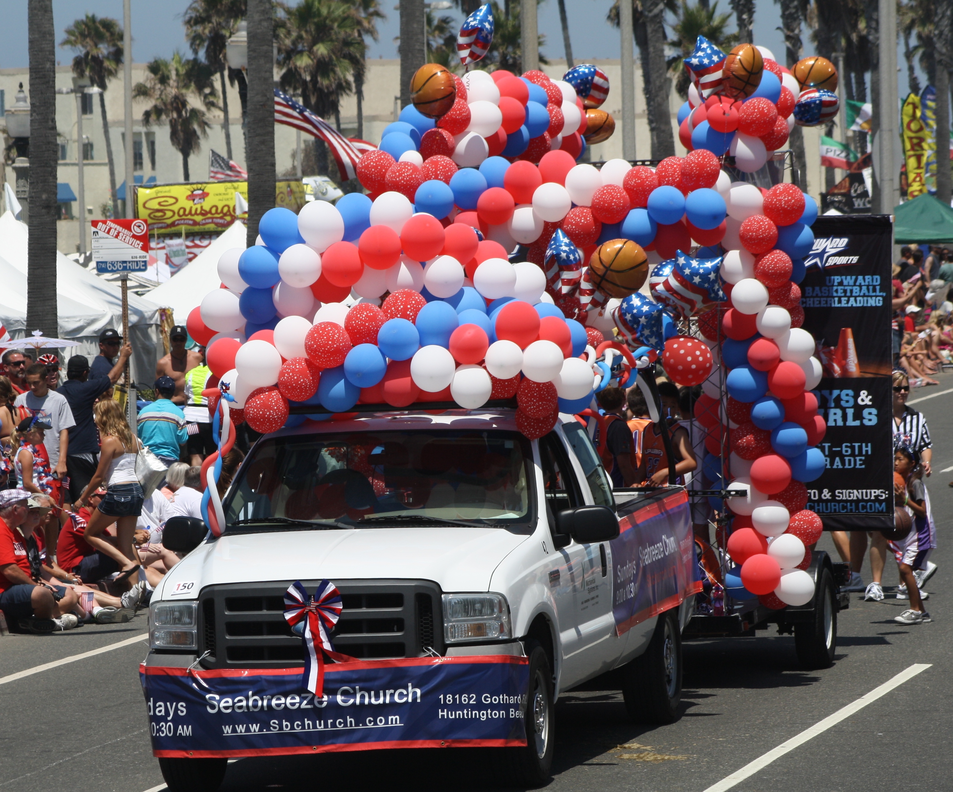 Huntington Beach 4. Juli Parade, Huntington Beach, Kalifornien. Aufwärts, Basketball und Cheerleading Teilnehmer von Seabreeze Kirche in Huntington Beach parade.
