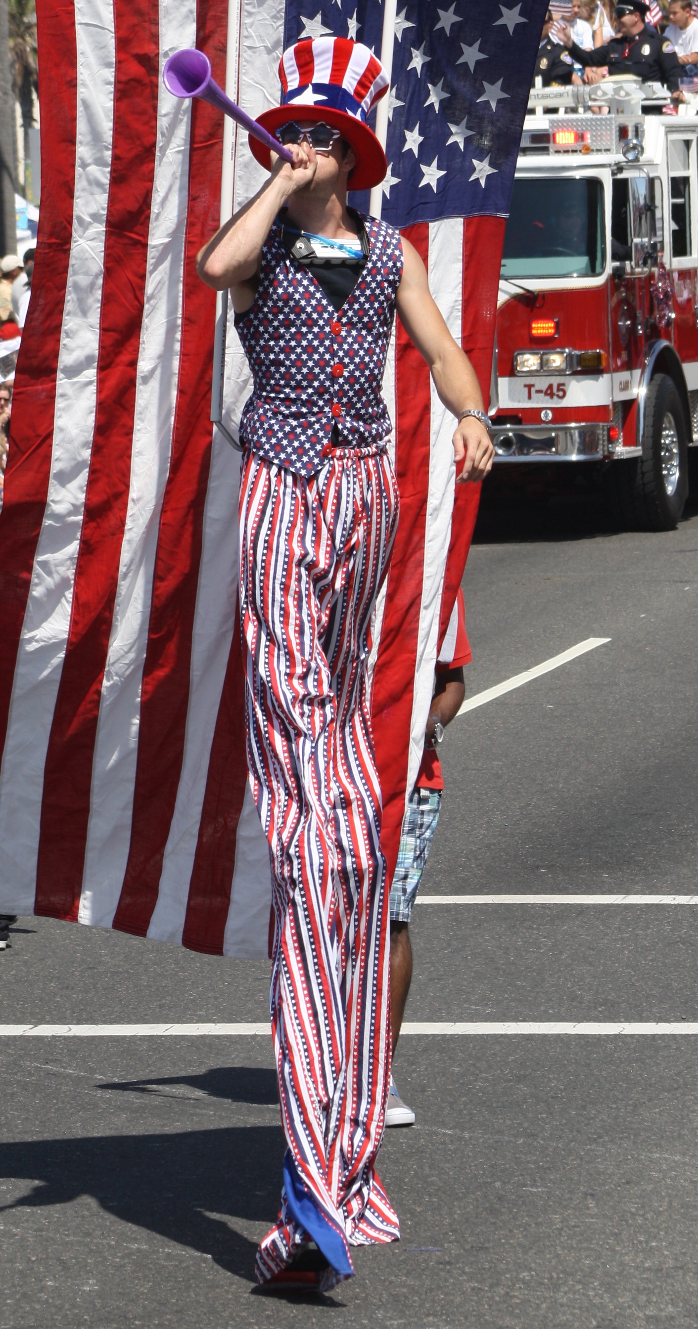 Huntington Beach Parade du 4 juillet, Huntington Beach, en Californie. L'homme marchant sur des échasses à Huntington Beach Parade.