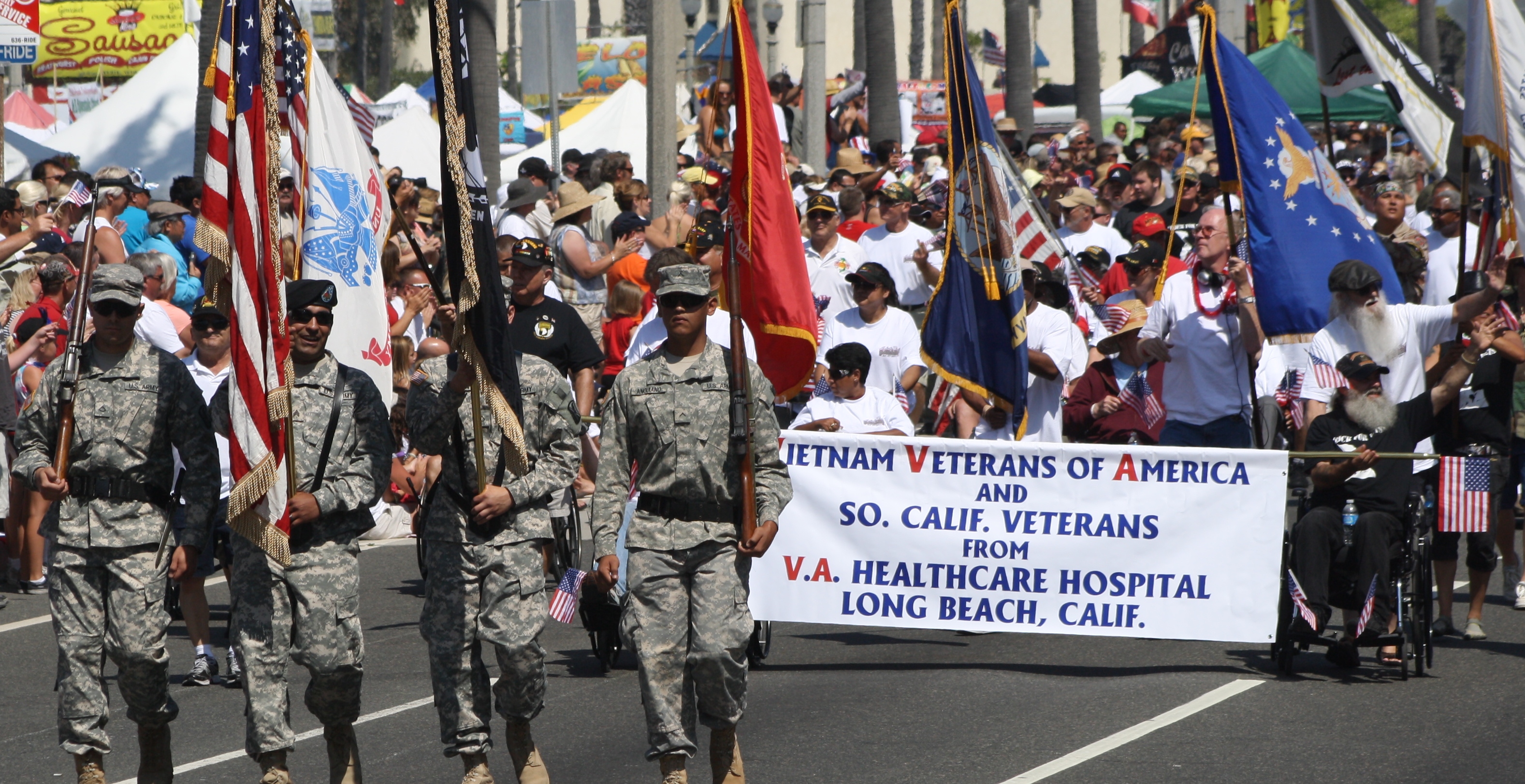 Huntington Beach Parade du 4 juillet, Huntington Beach, en Californie. Le Vietnam Veterans of America et le Sud de la Californie, d'anciens combattants VA de la Santé de l'Hôpital de Long en Californie avec des militaires de la garde d'honneur dans la maladie de Huntington Beach Parade.