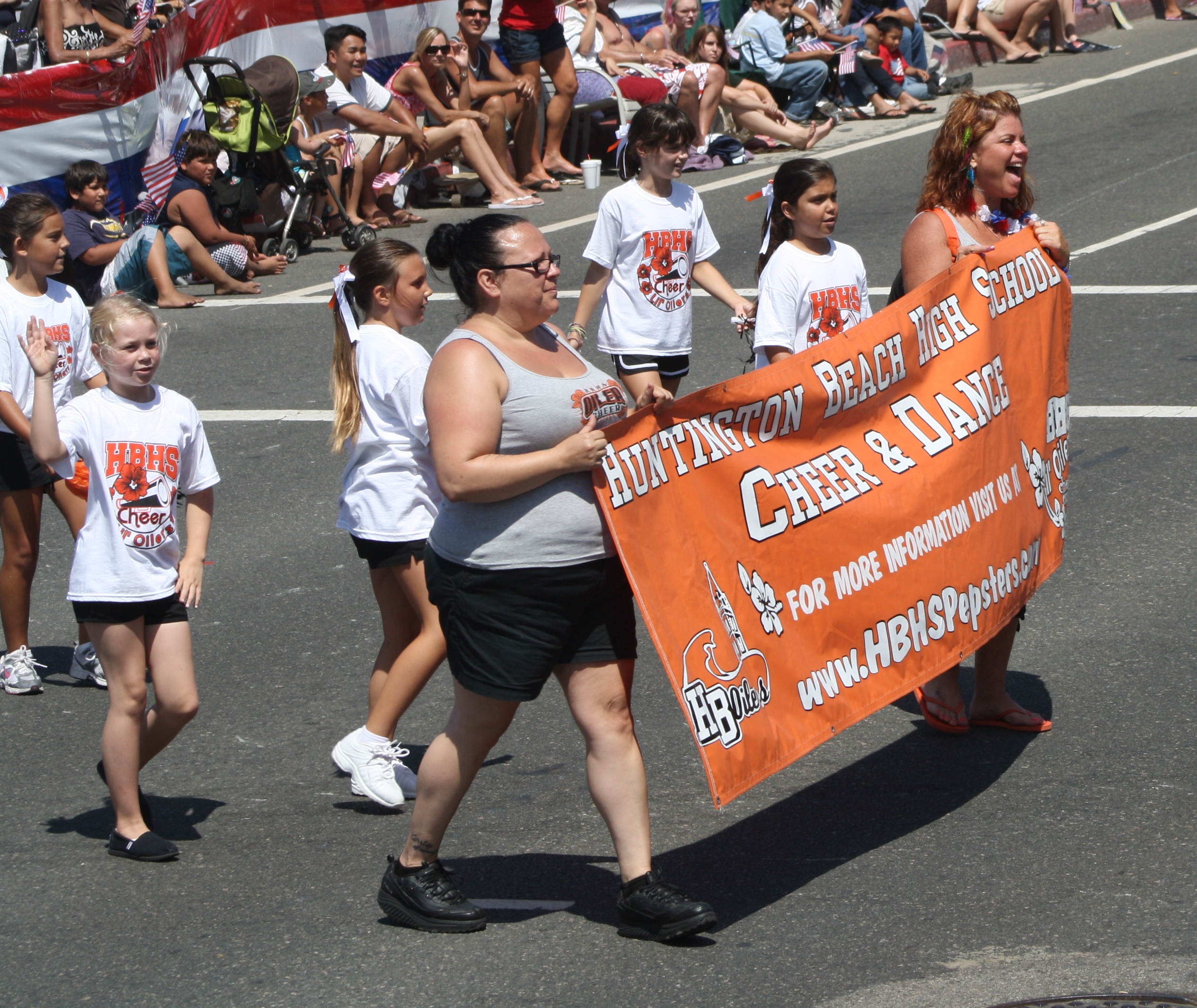 Хантингтон-Бич 4 июля парад, Хантингтон-Бич, Калифорния. Участники из Хантингтон-Бич средней школы развеселить и танец на пляже Хантингтон-парад. Фото Эдвард Pinchiff.