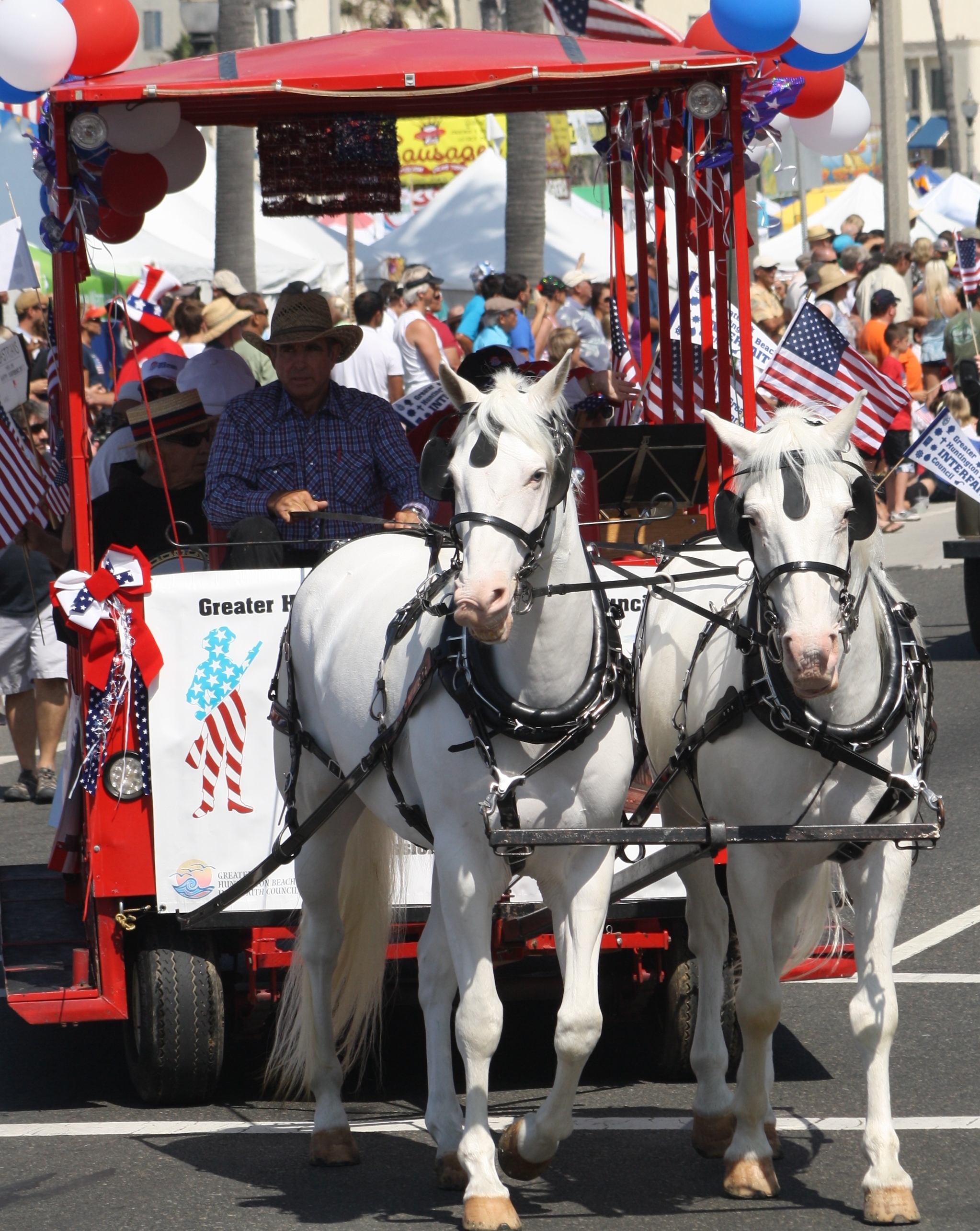 Хантингтон-Бич 4 июля парад, Хантингтон-Бич, Калифорния. Участники из Хантингтон-Бич Межрелигиозного Совета в конные вагонетки на пляже Хантингтон-парад.