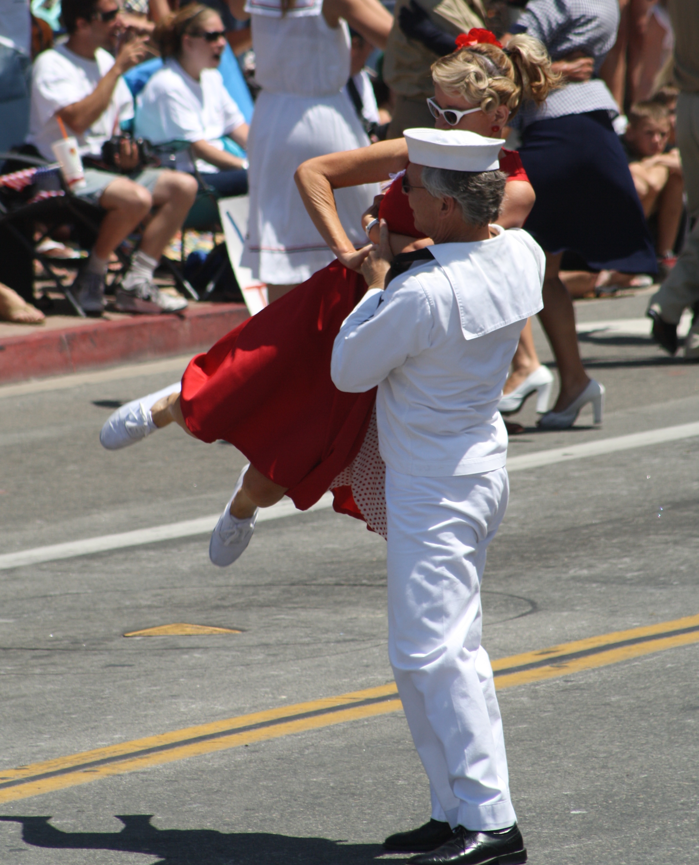 Хантингтон-Бич 4 июля парад, Хантингтон-Бич, Калифорния. Участники благородного дела фонда в старинный Второй Мировой Войны моряк равномерное одежда и танцы на пляже Хантингтон-парад.