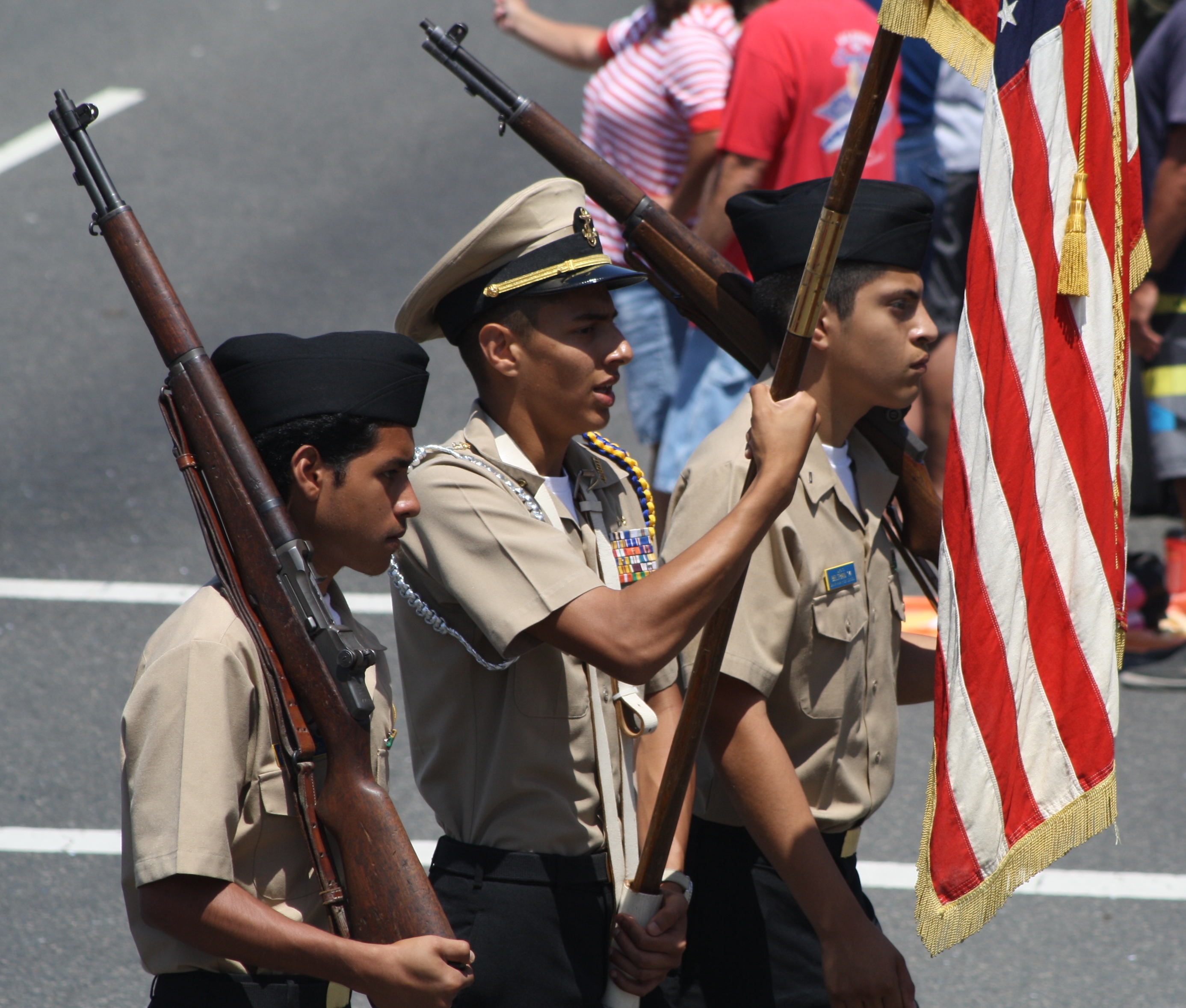 Хантингтон-Бич 4 июля парад, Хантингтон-Бич, Калифорния. Участники благородного дела фонда в старинный Второй Мировой Войны униформа с флагом и автоматами на пляже Хантингтон-парад.