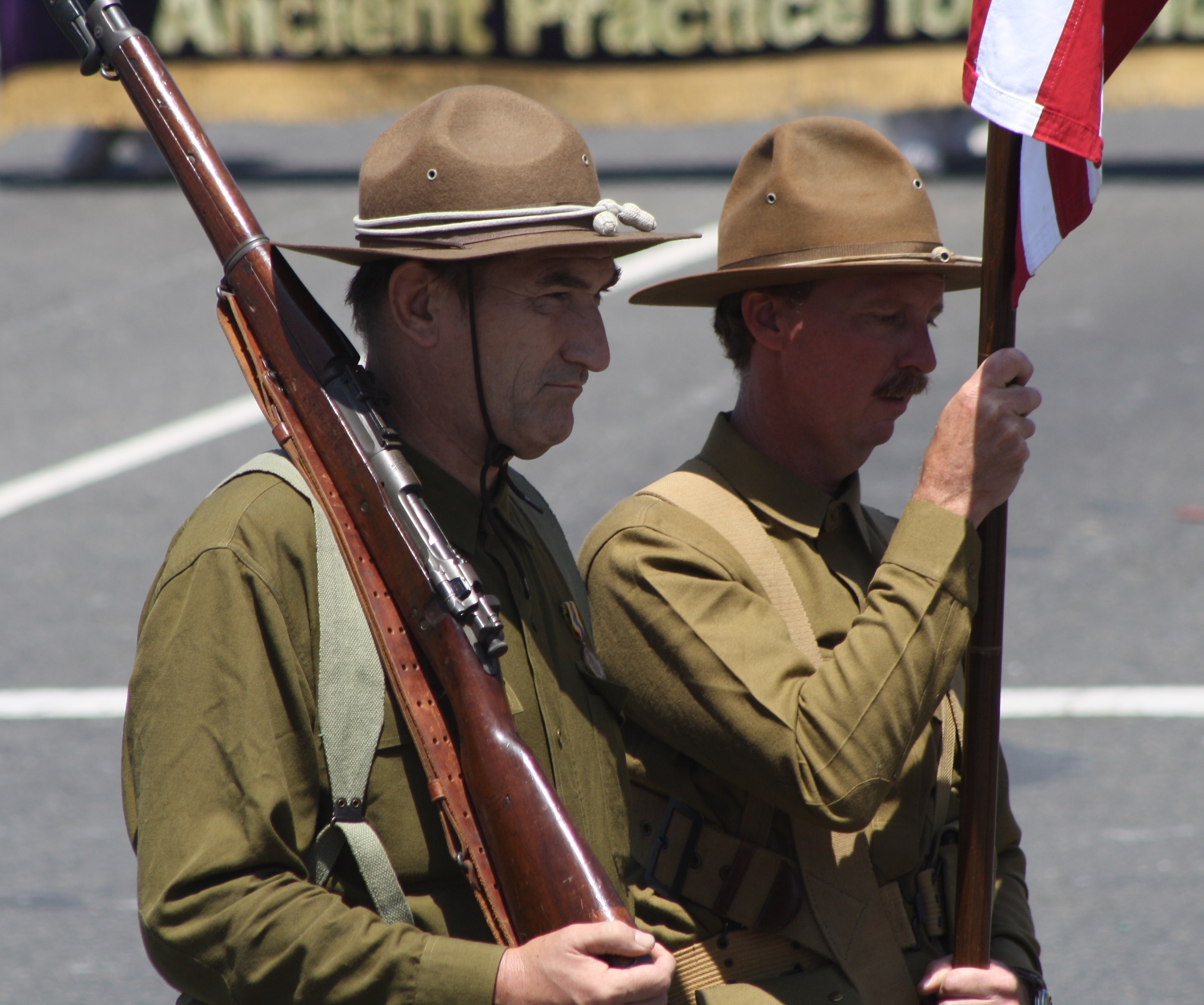 亨廷顿海滩月4日游行,亨廷顿海滩,加利福尼亚州。 崇高的事业基础的参与者在复古军服在亨廷顿海滩游行。