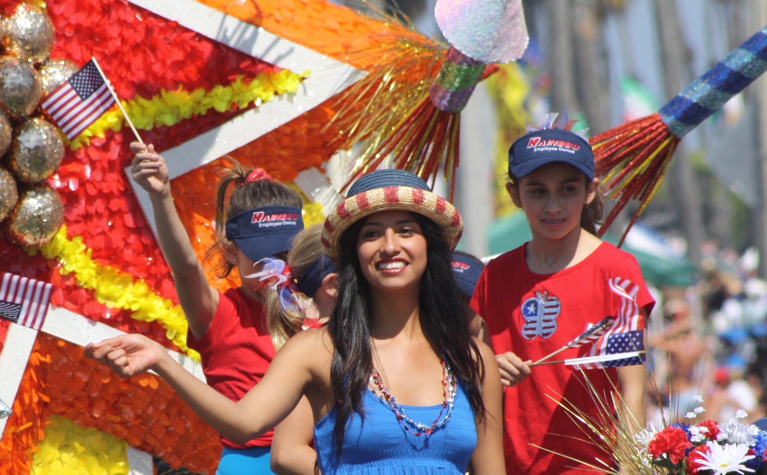 亨廷顿海滩月4日游行,亨廷顿海滩,加利福尼亚州。 与会者,包括罗Groh着一个浮游行彩虹处理亨廷顿海滩游行。